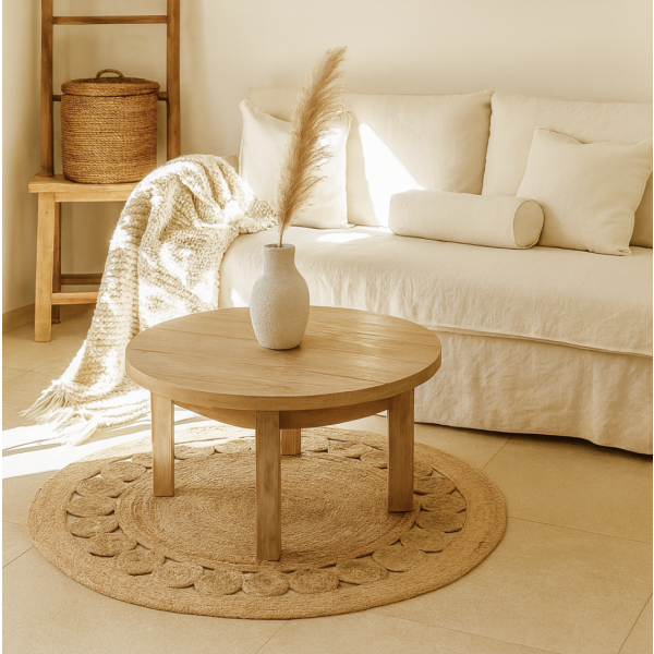 Combiná la Alfombra Circle M con muebles de madera clara, textiles en lino o algodón y plantas de interior. Su textura natural crea contraste con superficies frías como el cemento o la cerámica, aportando calidez visual sin recargar el espacio.