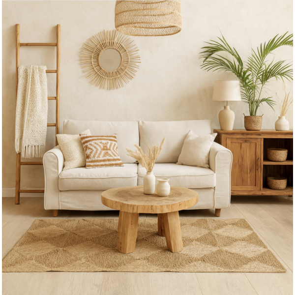 Colocala bajo una mesa baja o frente a un sofá para enmarcar el área de descanso. Si el espacio lo permite, acompañala con una manta o cojines en tonos similares para generar armonía visual y continuidad en la paleta.